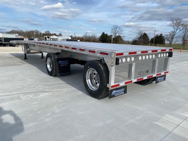 NEW Extreme Trailers XP55 48’ x 102” Aluminum Flatbed! All aluminum construction, aluminum frame, sides, rear and floor with (2) wood nail strips. King Pin set at 30”, galvanized fifth wheel plate. 122” widespread with full suspension dump and electric rear axle dump, front lift axle, MTM23T air ride suspension with 4S2M ABS, 5-year wheel end warranty, dual leveling valve for increased lift on front axle. LED lights (9) per side and 4L-5L-4L round light configuration on rear with clear lenses and stainless rings. Coil package, J-track side rail with stake pockets on 24” centers, double L style aluminum winch track, (12) sliding winches, (10) Extreme “T-Hooks”, front axle cover with lights, fully enclosed rear. 255/75R LP 22.5 tires on aluminum outside – steel inside wheels. Jost aluminum landing gear with 10-year warranty. 50,000 lbs. frame rating in 4’. Empty weight at 8,130 lbs. +/- 3%. FOB Villa Ridge MO, Belle Vernon PA, and Dover OH.