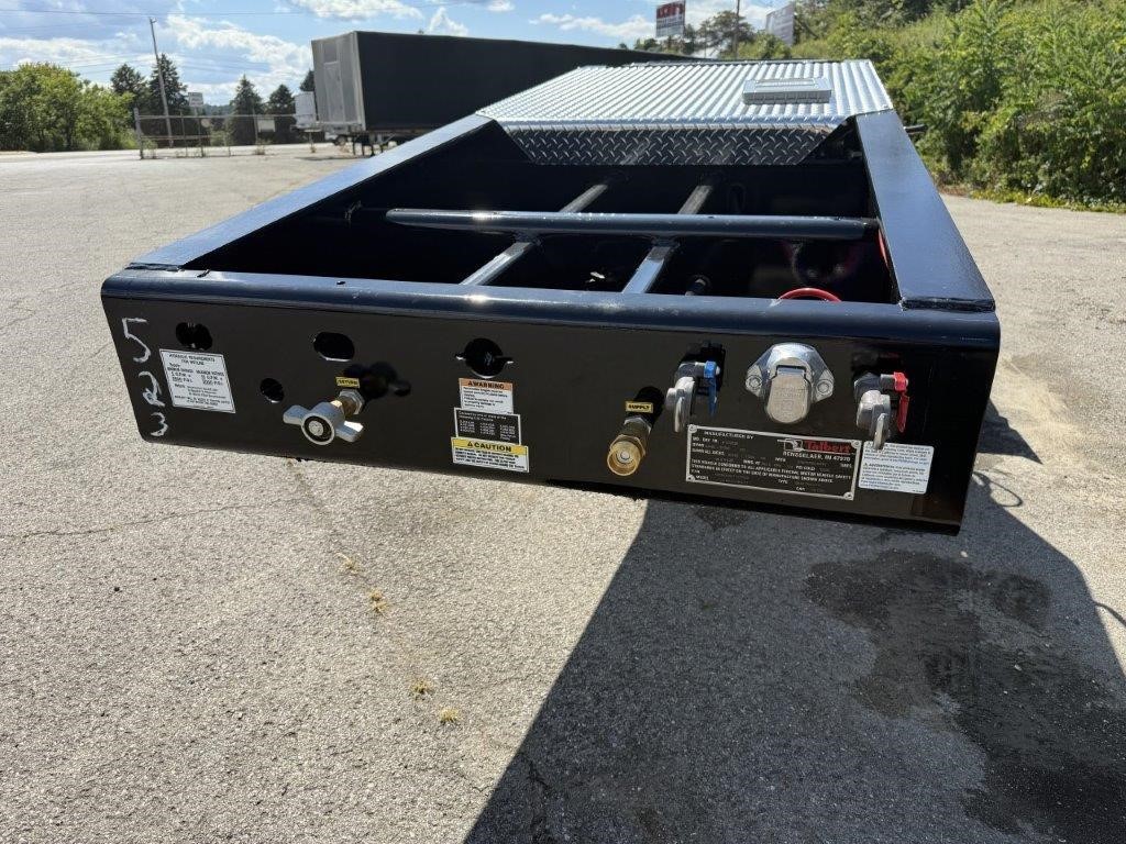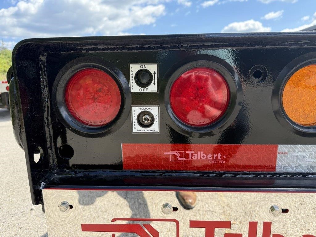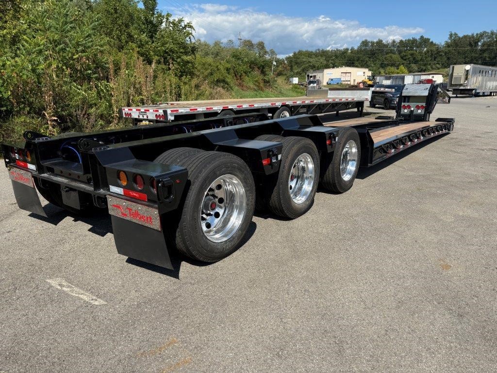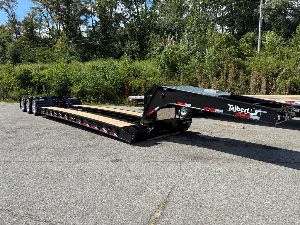 New Talbert 55CC Hydraulic RGN! 12” T-1A steel main beams, 110,000 lbs. in 13’ concentrated, 26’ well (25’-6” clear), 2” apitong wood deck. Removable kingpin for 108” and 90” swing radius, ¾” hydraulic couplings at front, ratchet style neck with adjustable ride height. Tri-axle with third axle air lift, 54” axle spacing, Ridewell air suspension, set up for additional fourth axle flip. 18’ loaded deck height, steel swingout outriggers, boom well. (32) lash rings. Manual raise and lower valve with manual exhaust valve, flag holders, liquid filled air gauge with conversion chart sticker. All LED lights, strobes at rear with a switch, battery back-up. 275/70R 22.5 tires on aluminum Dura-Bright outside wheels. Empty weight at 22,510 lbs. +/- 3%. FOB Belle Vernon, PA and Rensselaer, IN.