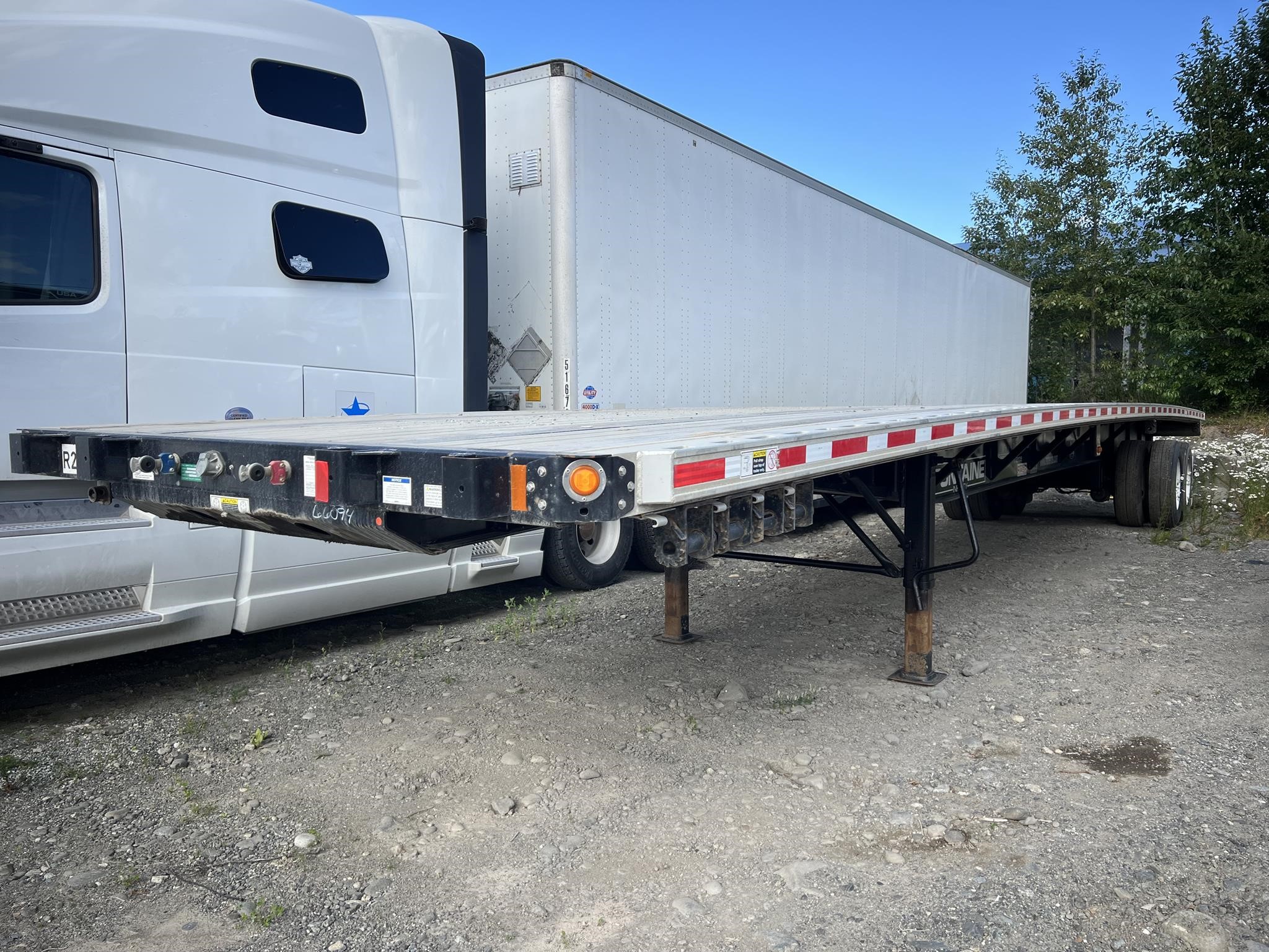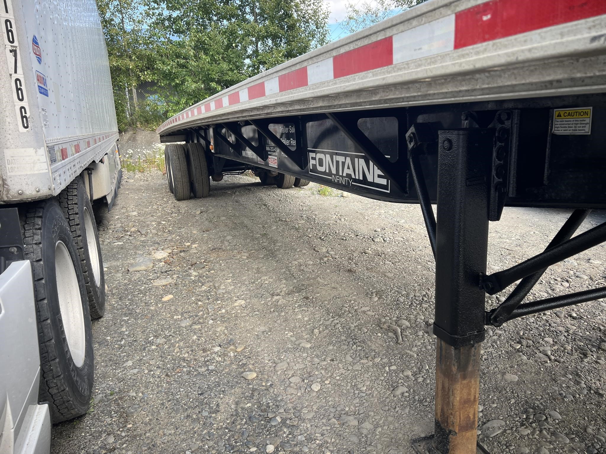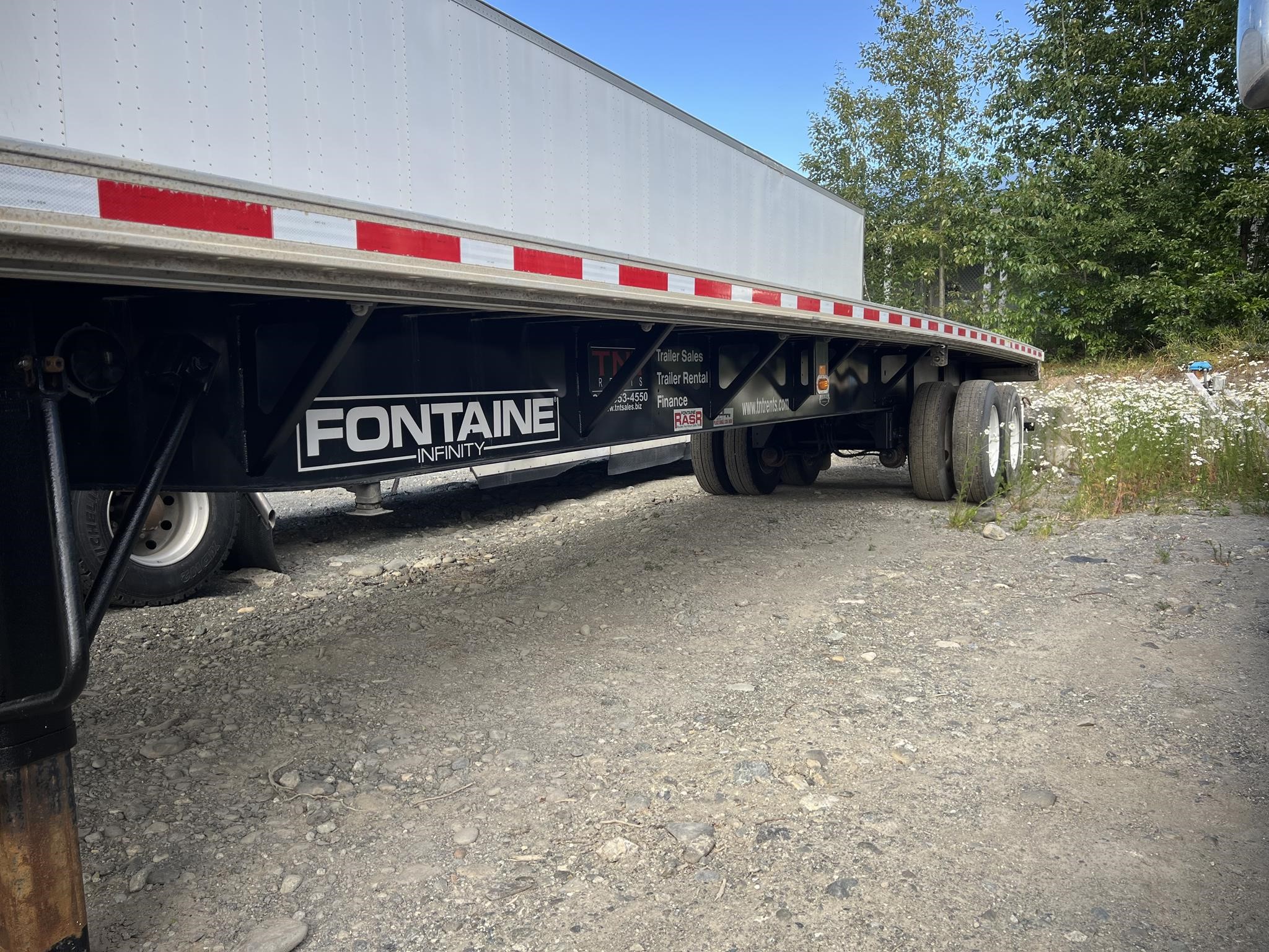 Fontaine Infinity 48’ x 102” Combination Flatbed with Sliding Tandem and Pintle Hitch! Combination aluminum and steel construction, steel crossmembers on 12” centers, aluminum sides, rear and floor with (4) wood nail strips. King Pin set at 30”. 49” closed sliding tandem axles with full suspension dump, Hendrickson air ride suspension with 4S/2M ABS, spring brakes, grease hubs. LED lights (3) per side and (2) per side on rear. One-piece RASR (Routed Aluminum Side Rails), Coil package, double L style winch track both sides, (12) sliding winches and hook retainers. 295/75R 22.5 tires on steel wheels. Forward and rear braced landing gear. FOB Anchorage, AL.