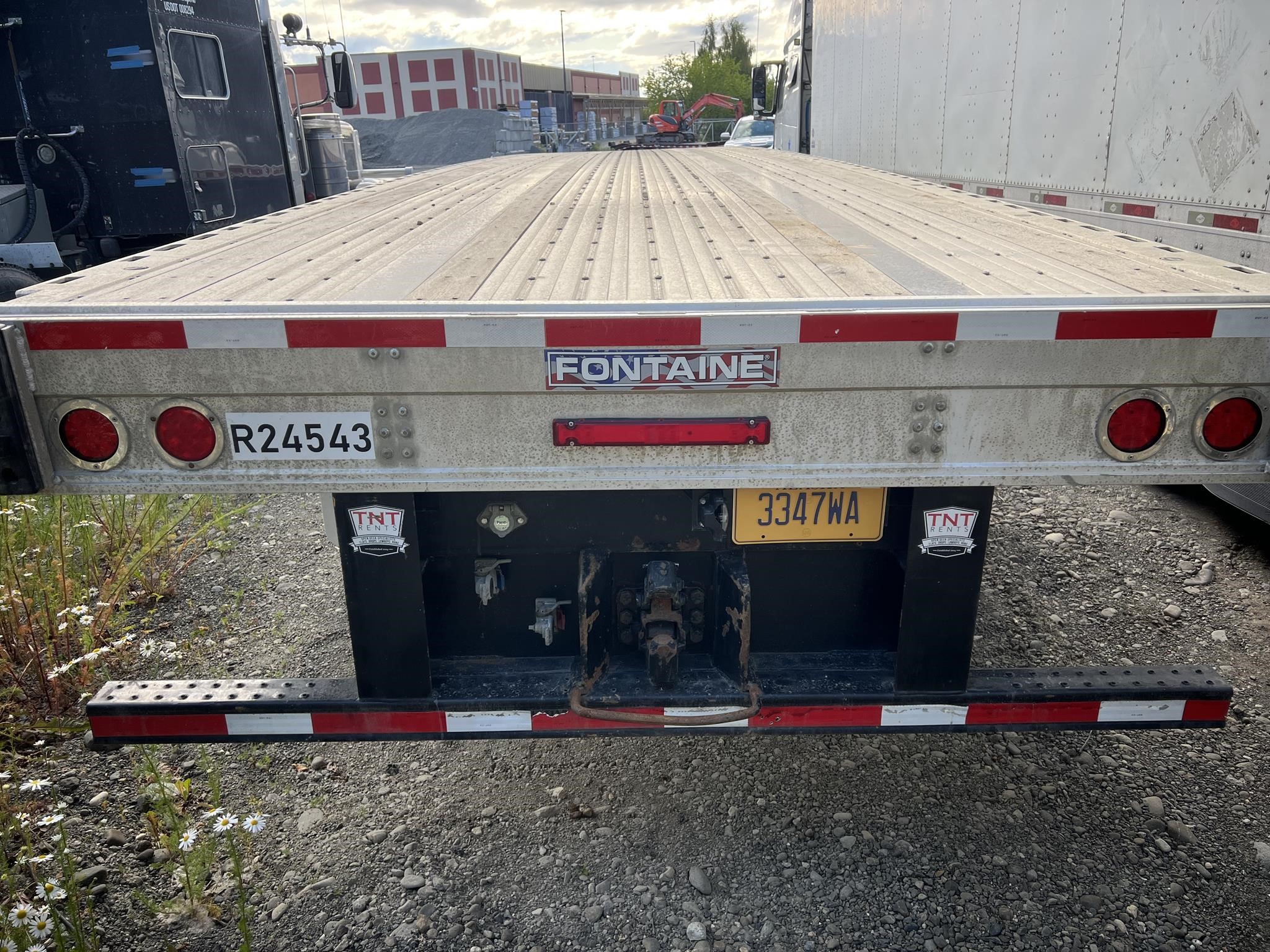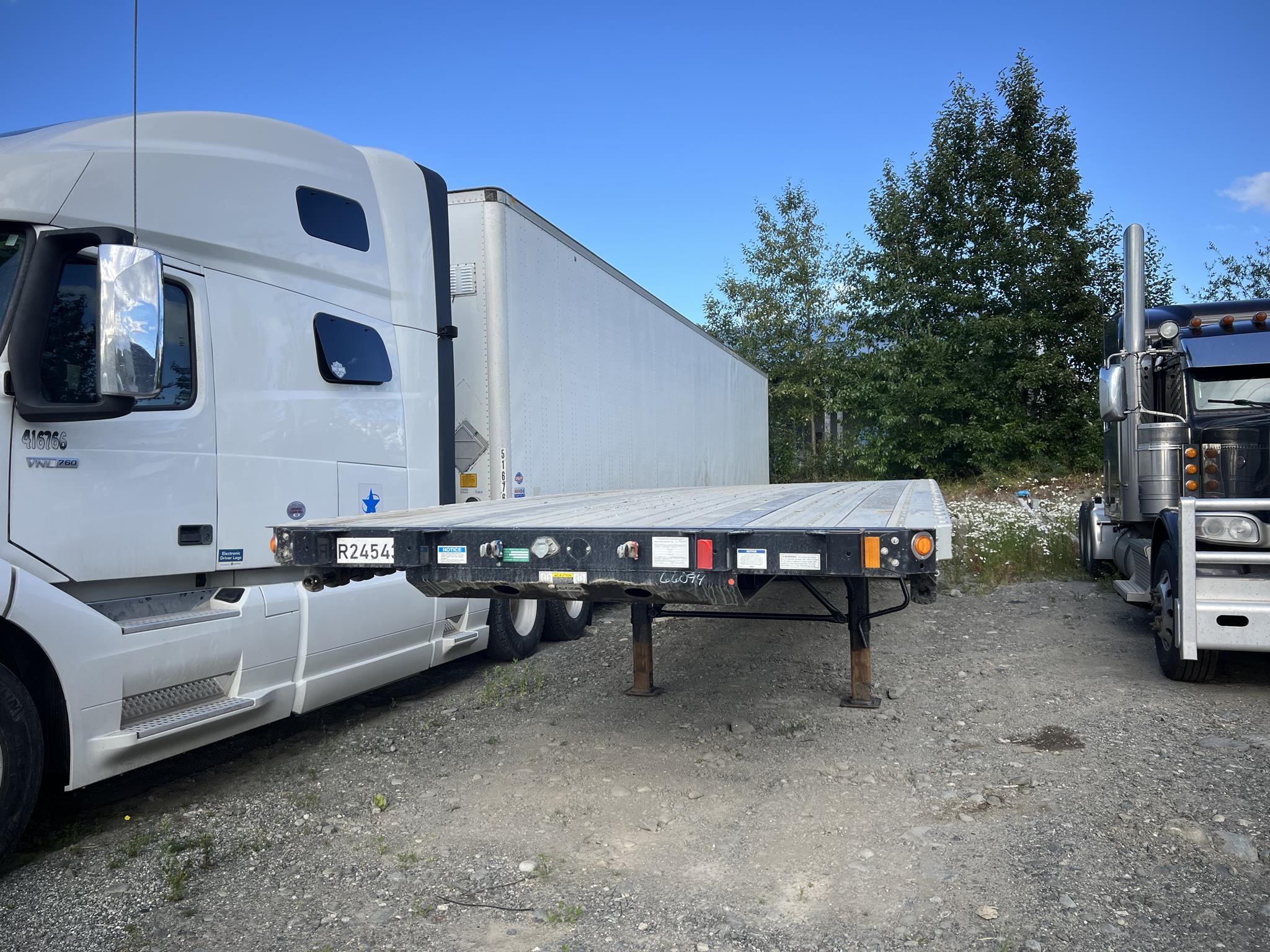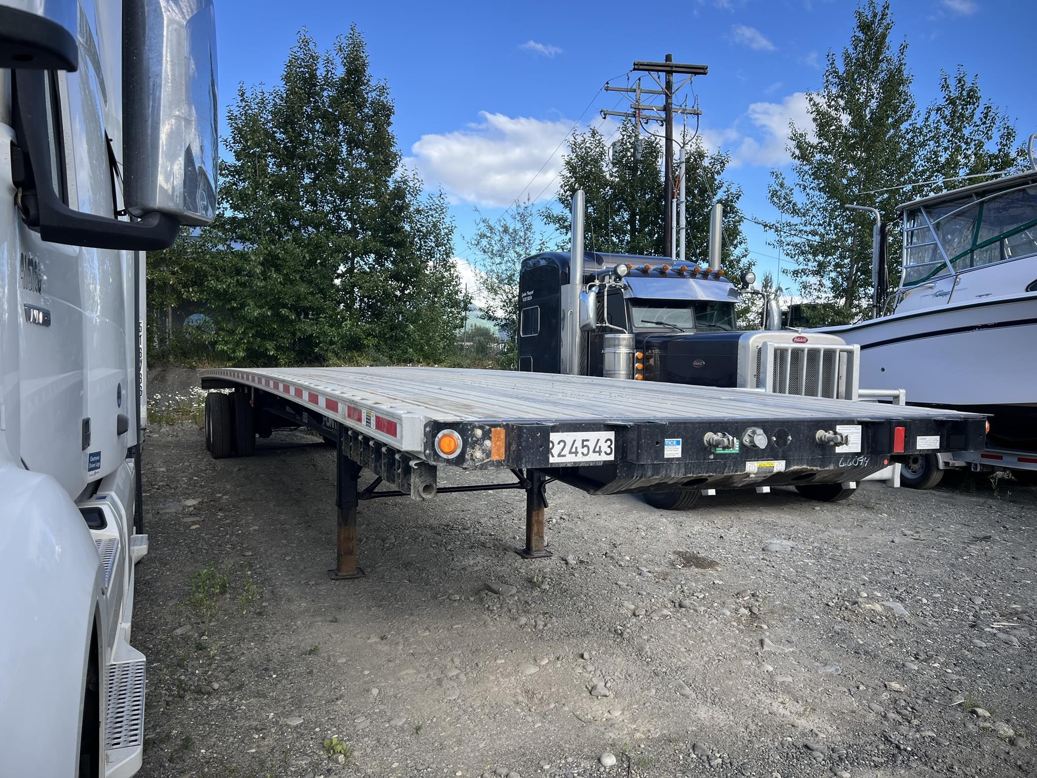 Fontaine Infinity 48’ x 102” Combination Flatbed with Sliding Tandem and Pintle Hitch! Combination aluminum and steel construction, steel crossmembers on 12” centers, aluminum sides, rear and floor with (4) wood nail strips. King Pin set at 30”. 49” closed sliding tandem axles with full suspension dump, Hendrickson air ride suspension with 4S/2M ABS, spring brakes, grease hubs. LED lights (3) per side and (2) per side on rear. One-piece RASR (Routed Aluminum Side Rails), Coil package, double L style winch track both sides, (12) sliding winches and hook retainers. 295/75R 22.5 tires on steel wheels. Forward and rear braced landing gear. FOB Anchorage, AL.