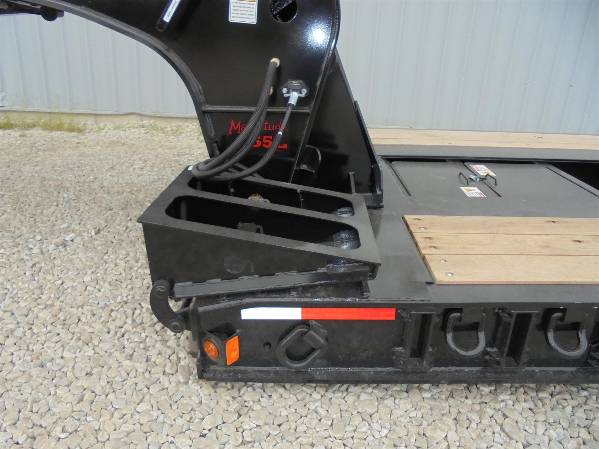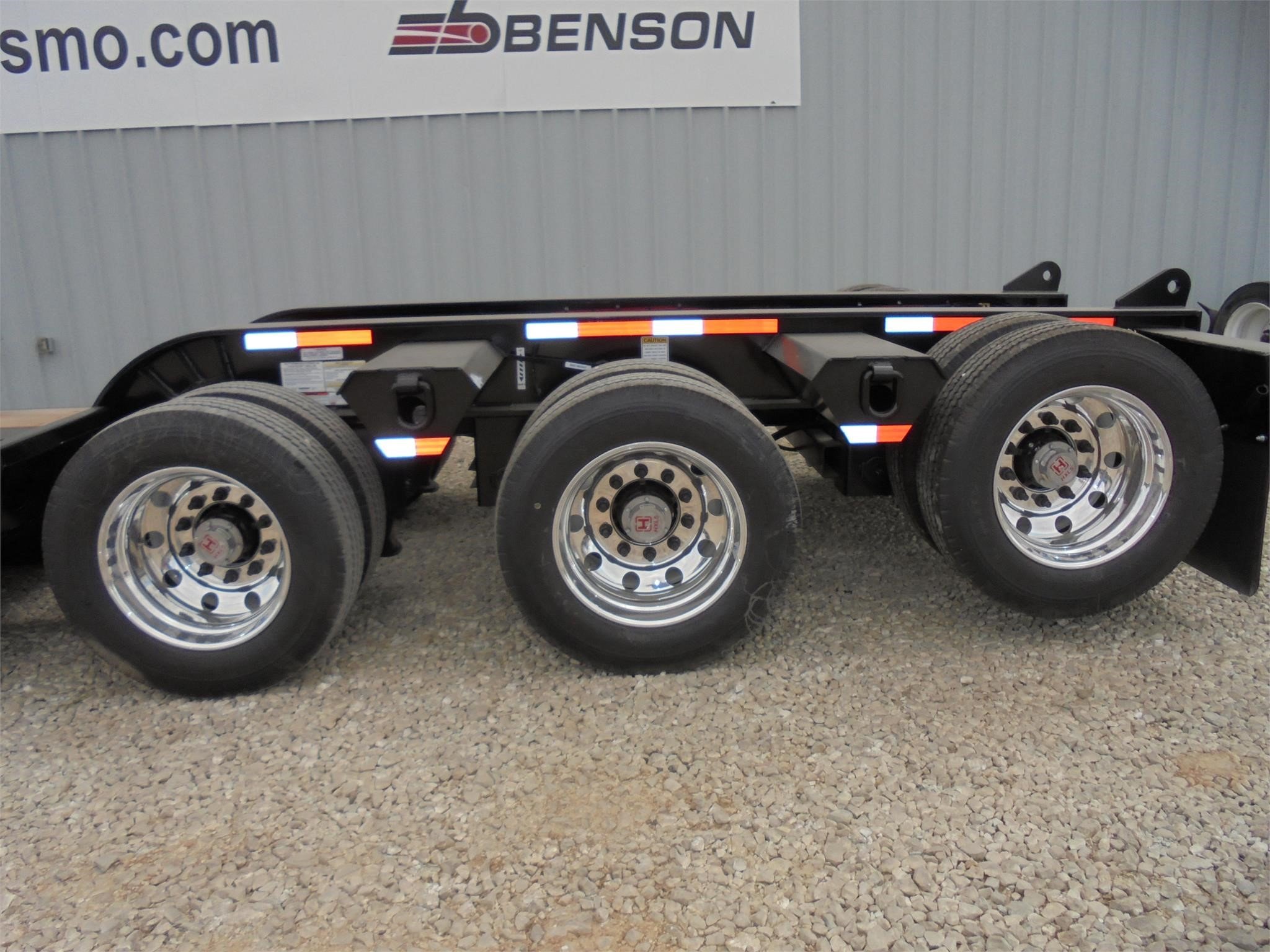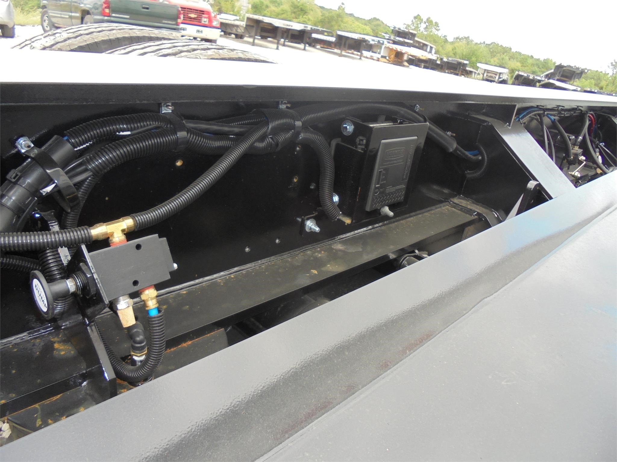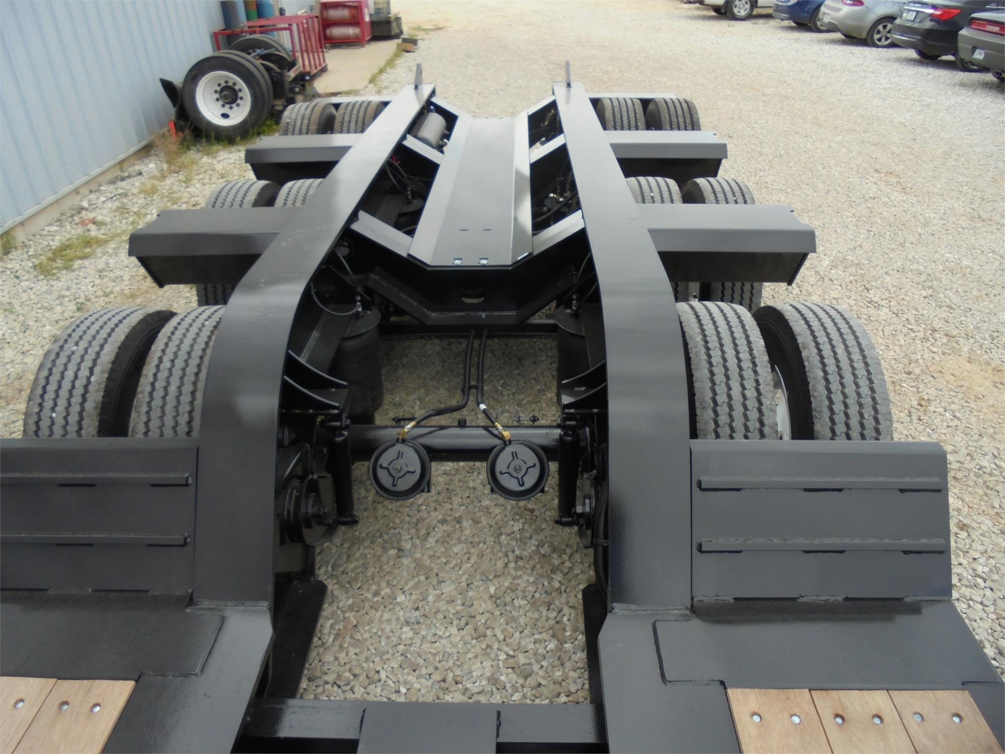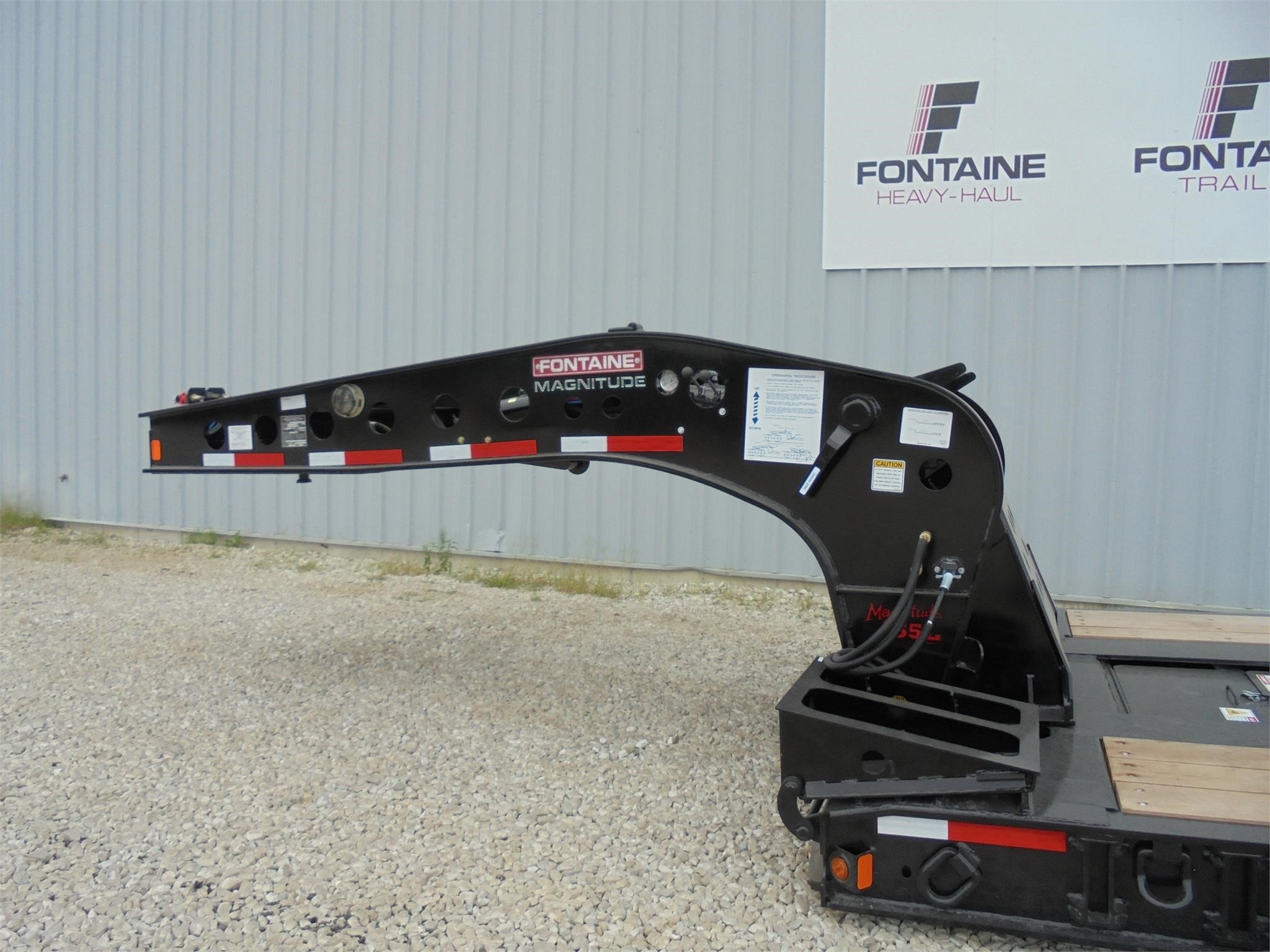 NEW Fontaine Workhorse 55-ton hydraulic detachable RGN tridem! 53’ x 102” Non-ground bearing design, all steel construction with 2” nominal wood floor, set up for a 4th axle flip or (run 4 in a row), 12’ 7” gooseneck with dual king pin at 108” and 89” swing radius, wet line operated, 26’ well with (2) fully covered/lockable storage trays, boom well in last (60”) of deck with two storage trays. 18” loaded deck height with 6” of ground clearance, ratchet style hydraulic neck, 7 ride height positions, includes (13) pair of swing out outriggers and (2) Pair HD Hook on Outriggers on front of deck, tri-axle air ride suspension (54.5” axle spacing), 3rd axle has an air lift, LED lights, strobes, low profile 275/70R 22.5 on steel wheels, (5) position mechanical ride height control, air gauge, (19) pair of D-rings, flag holders, rear boom well. Rated for 110,000#’s in a 13’ span. 22,041#’s +/-3% Photos show aluminum outer wheels that are available for an additional charge. FOB Belle Vernon PA, Villa Ridge MO, Springville AL.