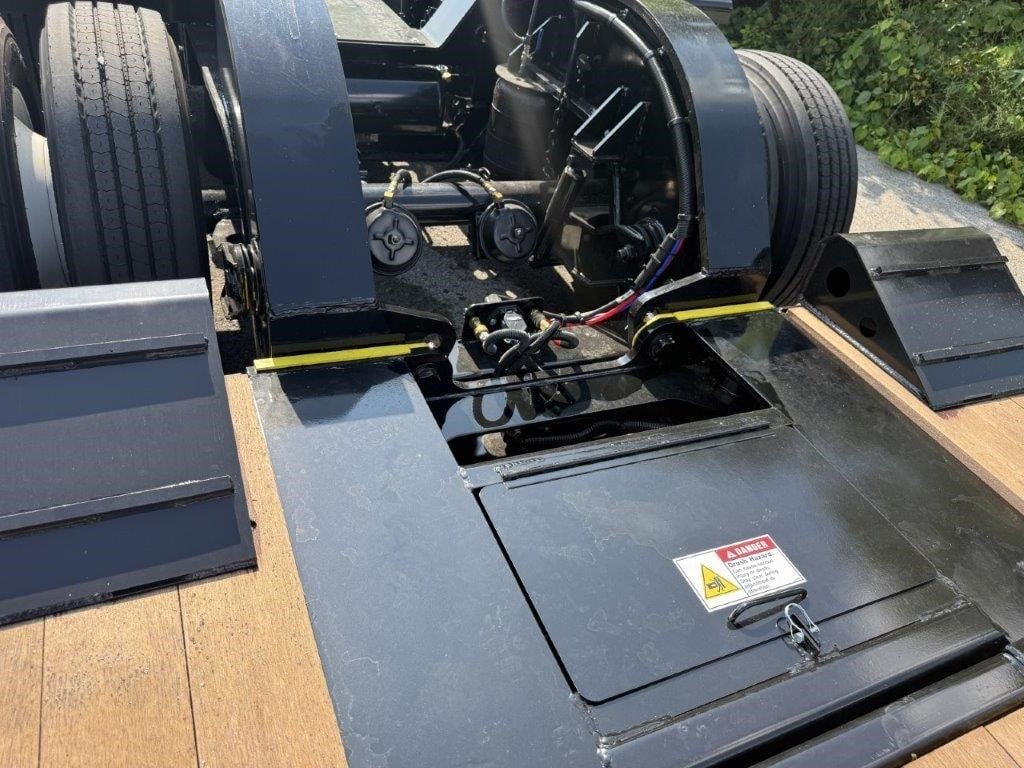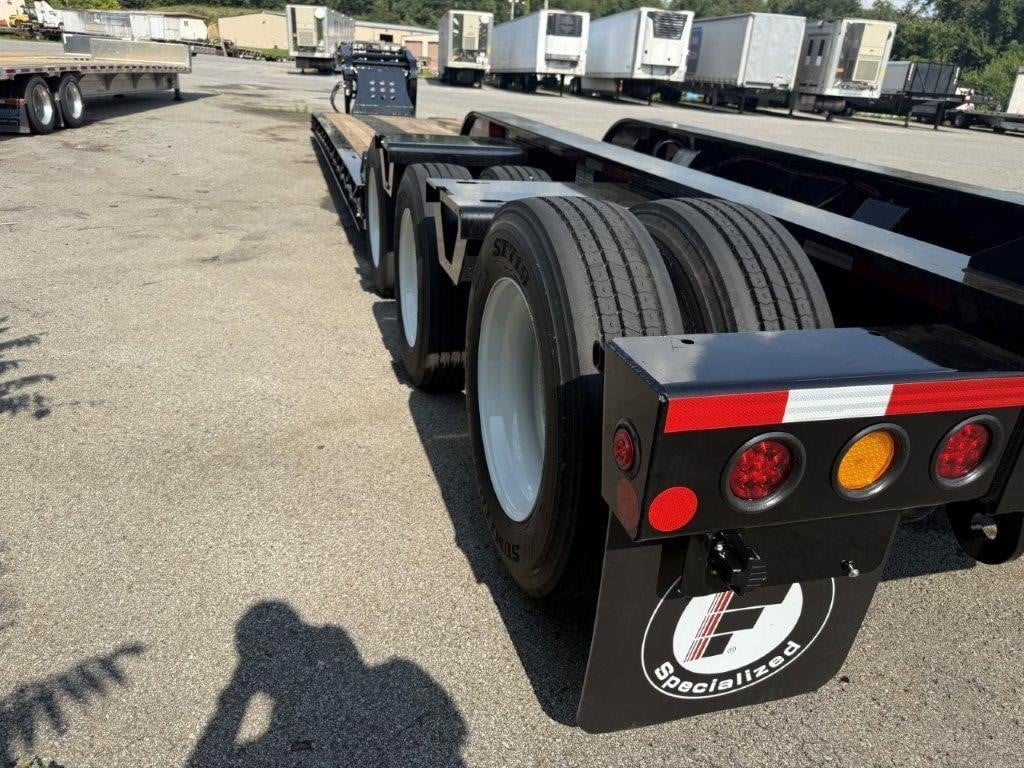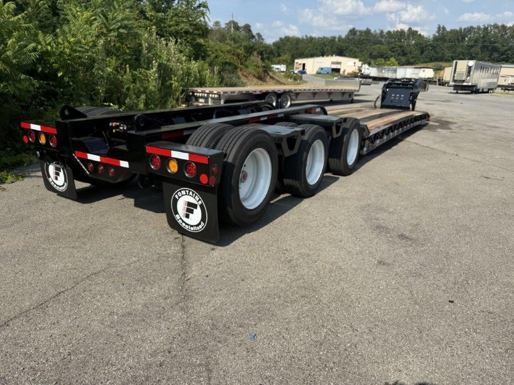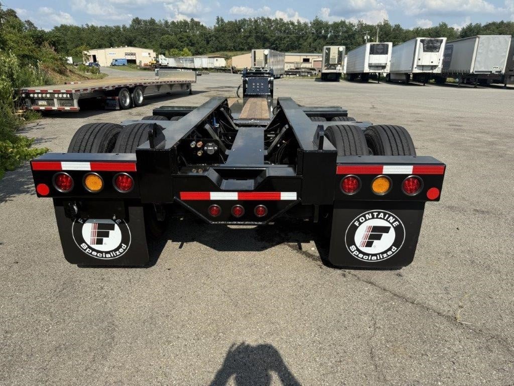 NEW Fontaine 55-ton S-T-R-E-T-C-H hydraulic detachable RGN tridem! 55 x 102 stretches out to 76’ x 102” Non-ground bearing design, all steel construction with 2” Apitong floor, set up for a flip neck extension (aka flip box) as well as a 4th axle flip or stinger (run 4 in a row or a 3+1), 11’ 11” gooseneck with 102” swing radius without optional flip neck and 125” with optional flip neck, 29’-4″ well closed and up to 50’-4″ in full open, 20” loaded deck height with 6” of ground clearance, ratchet style hydraulic neck with 7 ride height positions wet line operated , includes (14) pair of swing out outriggers, (1) pair of drop in outriggers, modular design detachable bogie tri-axle air ride suspension (60” axle spacing), 3rd axle has an air lift and the first axle has a chain lift so you can lift the first and third axles, LED lights, strobes, low profile 275/70R 22.5 on steel wheels, raise/lower valve, air gauge, (12) pair of D-rings, flag holders, boom well. Rated for 110,000#’s in a 16’ span, 27,511#’s +/- 3% Photos show optional pony motor available for additional charge. FOB Belle Vernon PA, FOB Villa Ridge MO, Springville AL, Anchorage, AK.