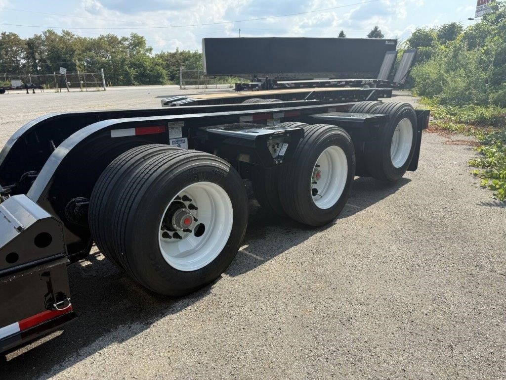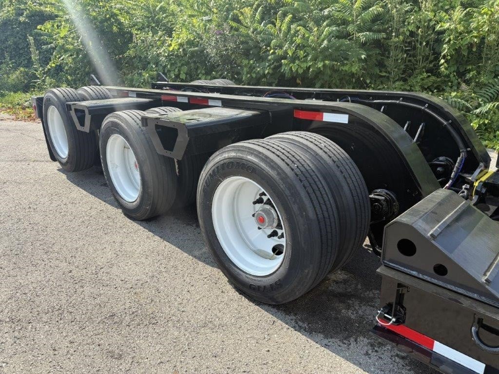 NEW Fontaine 55-ton S-T-R-E-T-C-H hydraulic detachable RGN tridem! 55 x 102 stretches out to 76’ x 102” Non-ground bearing design, all steel construction with 2” Apitong floor, set up for a flip neck extension (aka flip box) as well as a 4th axle flip or stinger (run 4 in a row or a 3+1), 11’ 11” gooseneck with 102” swing radius without optional flip neck and 125” with optional flip neck, 29’-4″ well closed and up to 50’-4″ in full open, 20” loaded deck height with 6” of ground clearance, ratchet style hydraulic neck with 7 ride height positions wet line operated , includes (14) pair of swing out outriggers, (1) pair of drop in outriggers, modular design detachable bogie tri-axle air ride suspension (60” axle spacing), 3rd axle has an air lift and the first axle has a chain lift so you can lift the first and third axles, LED lights, strobes, low profile 275/70R 22.5 on steel wheels, raise/lower valve, air gauge, (12) pair of D-rings, flag holders, boom well. Rated for 110,000#’s in a 16’ span, 27,511#’s +/- 3% Photos show optional pony motor available for additional charge. FOB Belle Vernon PA, FOB Villa Ridge MO, Springville AL, Anchorage, AK.