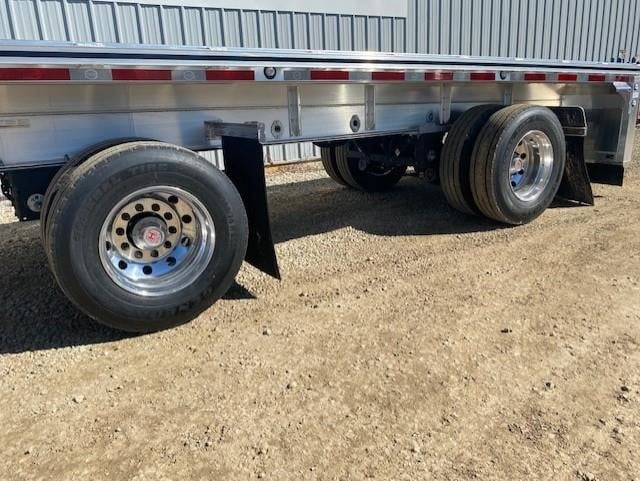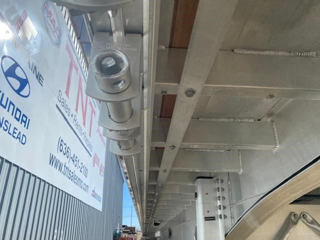 New Mac 53 x 102 TNT Series aluminum flatbed with sliding rear axle California & Canada Legal, all aluminum construction, front sides rear floor and frame, rated for 90,000#’s overall and 52,000#’s in 4′ and 60,000#’s in 20′ concentrated, coil package, Hendrickson INTRAAX 122″ widespread air ride suspension with sliding rear axle (California & Canada Legal in the closed position), 30″ king pin setting, powder coated 5th wheel plate, 3 1/2″ arch, coil package, Hendrickson HXL 5 hubs (extended warranty on axles and wheel ends) (2) wood nail strips, double pipe spools between stake pockets, (5) rows of J hook track (J hooks available for additional charge) , winch track both sides with (12) galvanized sliding winches and tie down bar both sides, all clear lens LED lighting, (9) marker lights per side, 4-5-4 rear light pattern (all large 4″ lights) , fully enclosed rear end, electric rear axle dump valve, full suspension dump wired to auxiliary 7 way ISO plug, manual full suspension dump, aluminum air tank, (2) 16″ long rubber dock bumpers, (4) polished aluminum wheels outside / steel inside on LP 22.5 tires, Jost AX-150 Aluminum top landing gear , registration holder, Estimated empty weight 10,047# +/- 3%