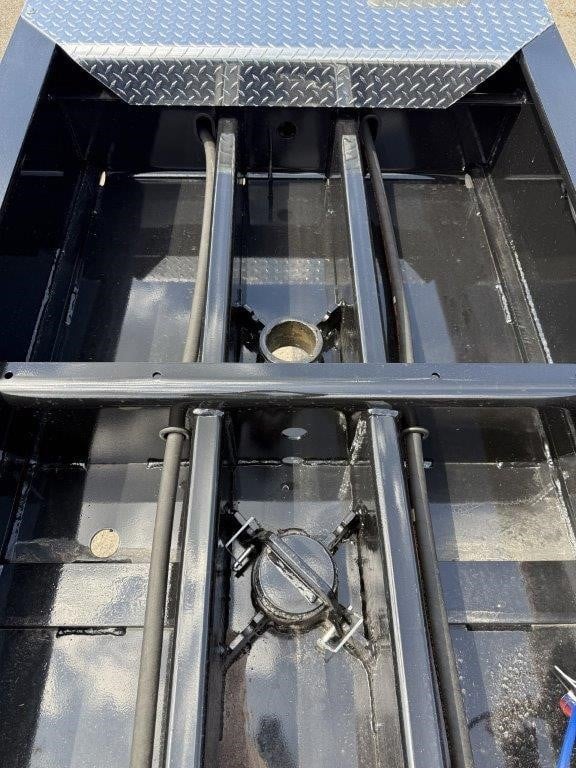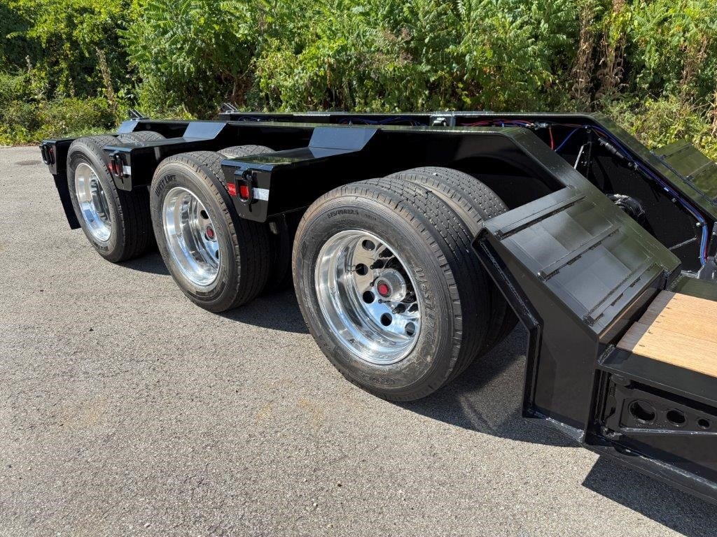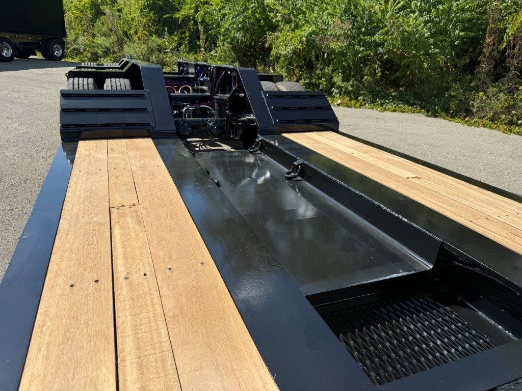 New Talbert 55CC Hydraulic RGN! 12” T-1A steel main beams, 110,000 lbs. in 13’ concentrated, 26’ well (25’-6” clear), 2” apitong wood deck. Removable kingpin for 108” and 90” swing radius, ¾” hydraulic couplings at front, ratchet style neck with adjustable ride height. Tri-axle with third axle air lift, 54” axle spacing, Ridewell air suspension, set up for additional fourth axle flip. 18’ loaded deck height, steel swingout outriggers, boom well. (32) lash rings. Manual raise and lower valve with manual exhaust valve, flag holders, liquid filled air gauge with conversion chart sticker. All LED lights, strobes at rear with a switch, battery back-up. 275/70R 22.5 tires on aluminum Dura-Bright outside wheels. Empty weight at 22,510 lbs. +/- 3%. FOB Belle Vernon, PA and Rensselaer, IN.